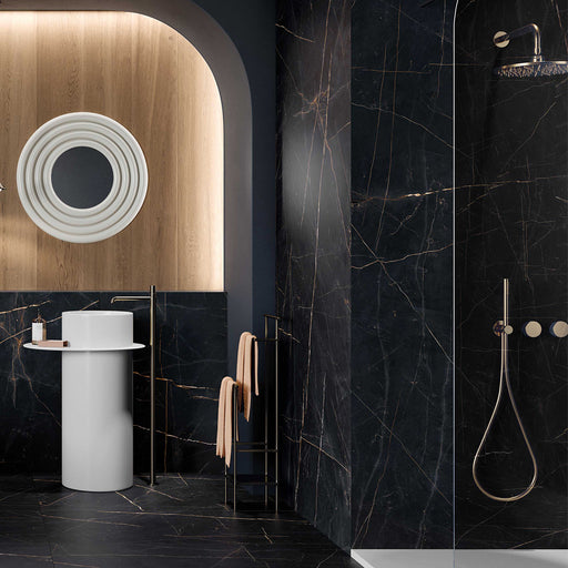 View full detailsBassano Precious Noir is a bold marble effect tile defined by depth, contrast and refined surface detail. The colour is a rich, inky black with de...