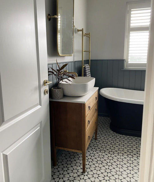Agraba Navy brings a bold, clean look to Moroccan tile design with its rich navy blue and crisp white pattern. This 20×20cm porcelain tile offers s...