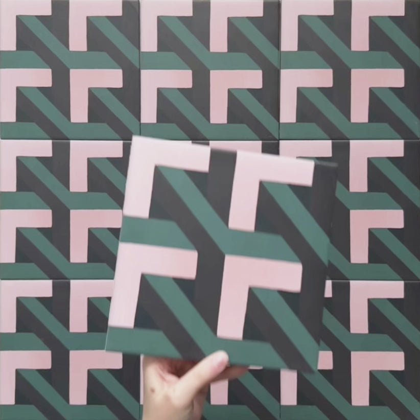 Geometry Lagoon redefines contemporary design with a bold interplay of shape and colour. This 20×20 cm porcelain tile features a striking interlocking pattern of blush pink, deep green, and black, creating a layered geometric effect that feels both structured and artistic. Its clean lines and matt finish lend a sophisticated edge, perfect for adding visual depth and personality to modern interiors.