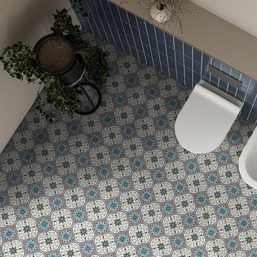 Cabana brings a joyful, floral-inspired design to the Cabana collection. Each 20×20cm tile combines soft pink and green tones with accents of white, mustard, and black, forming a bold quatrefoil-style motif that repeats beautifully across larger surfaces. With its matt finish and vintage charm, it channels the spirit of Cuban encaustic tiles in a durable porcelain format.