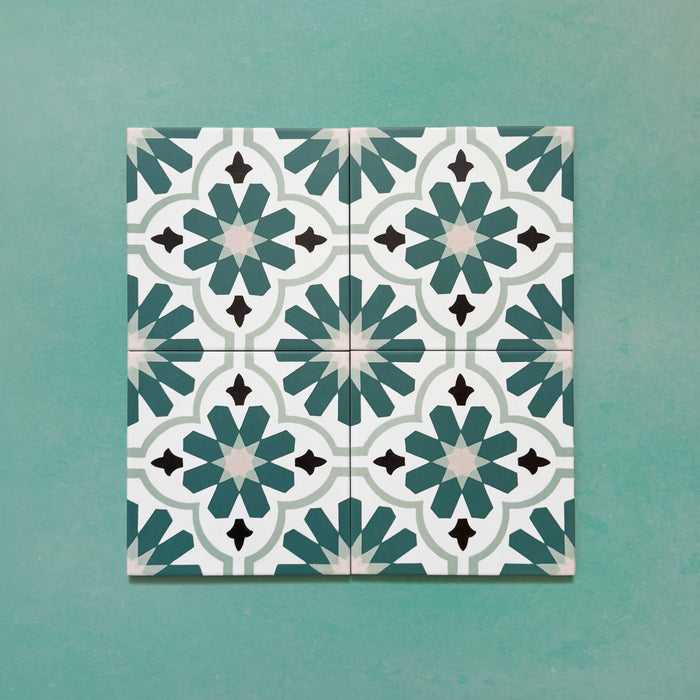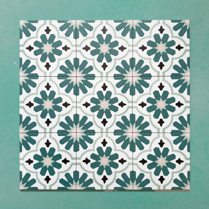 Clarence House Teal Green combines traditional floral motifs with a refreshing teal palette for a timeless yet modern statement. Measuring 20×20cm, this porcelain tile features a crisp geometric flower design that brings depth and character to walls and floors alike. Its balanced tones make it an elegant choice for both contemporary and period-style interiors.