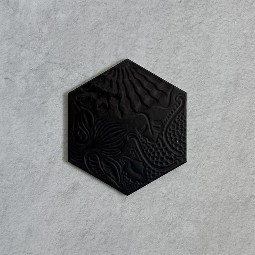 Barcelona Hexagon Black captures the bold, architectural character of the collection with its deep satin surface and intricate raised patterning inspired by Gaudí’s original designs. The 25×22cm hexagon format enhances the sculptural detail, while the contrast between matt and subtle gloss elements adds depth and movement across the tile.