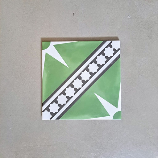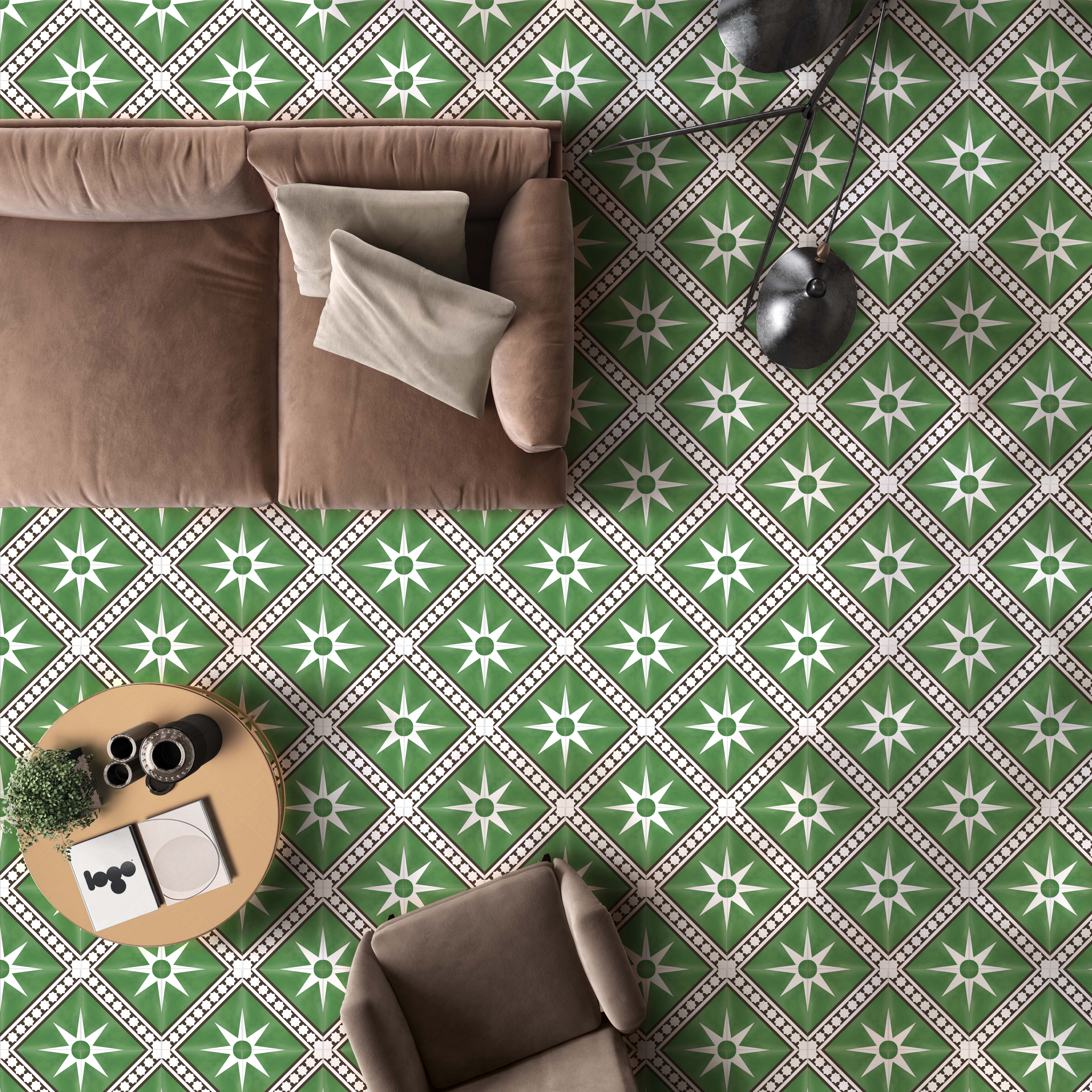 Galata Green delivers bold Moroccan-inspired style with a refreshing edge. This 20×20cm porcelain tile showcases a striking green backdrop enhanced by crisp white star motifs and black geometric detailing. The matt finish grounds the design, making it both eye-catching and versatile for a range of settings.
